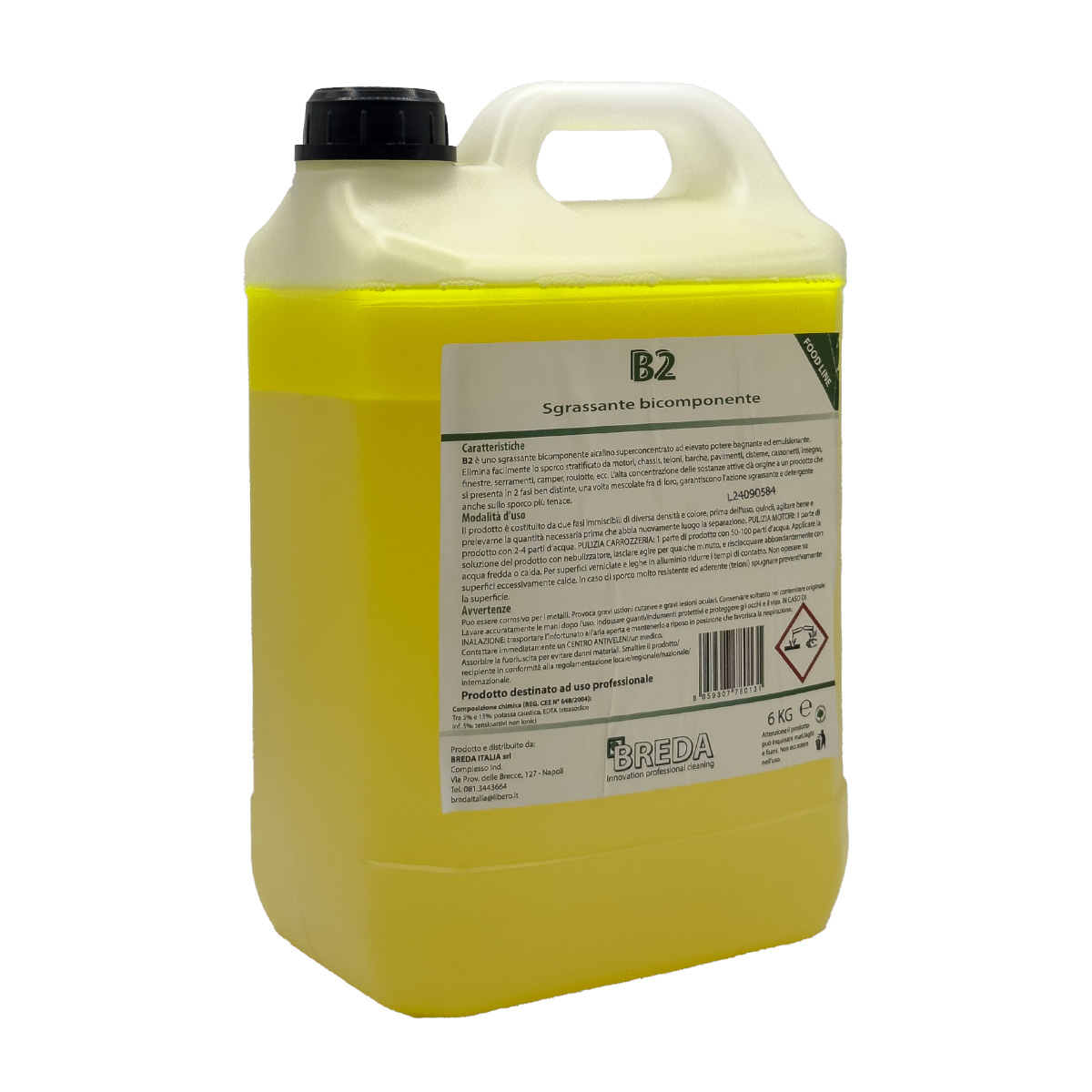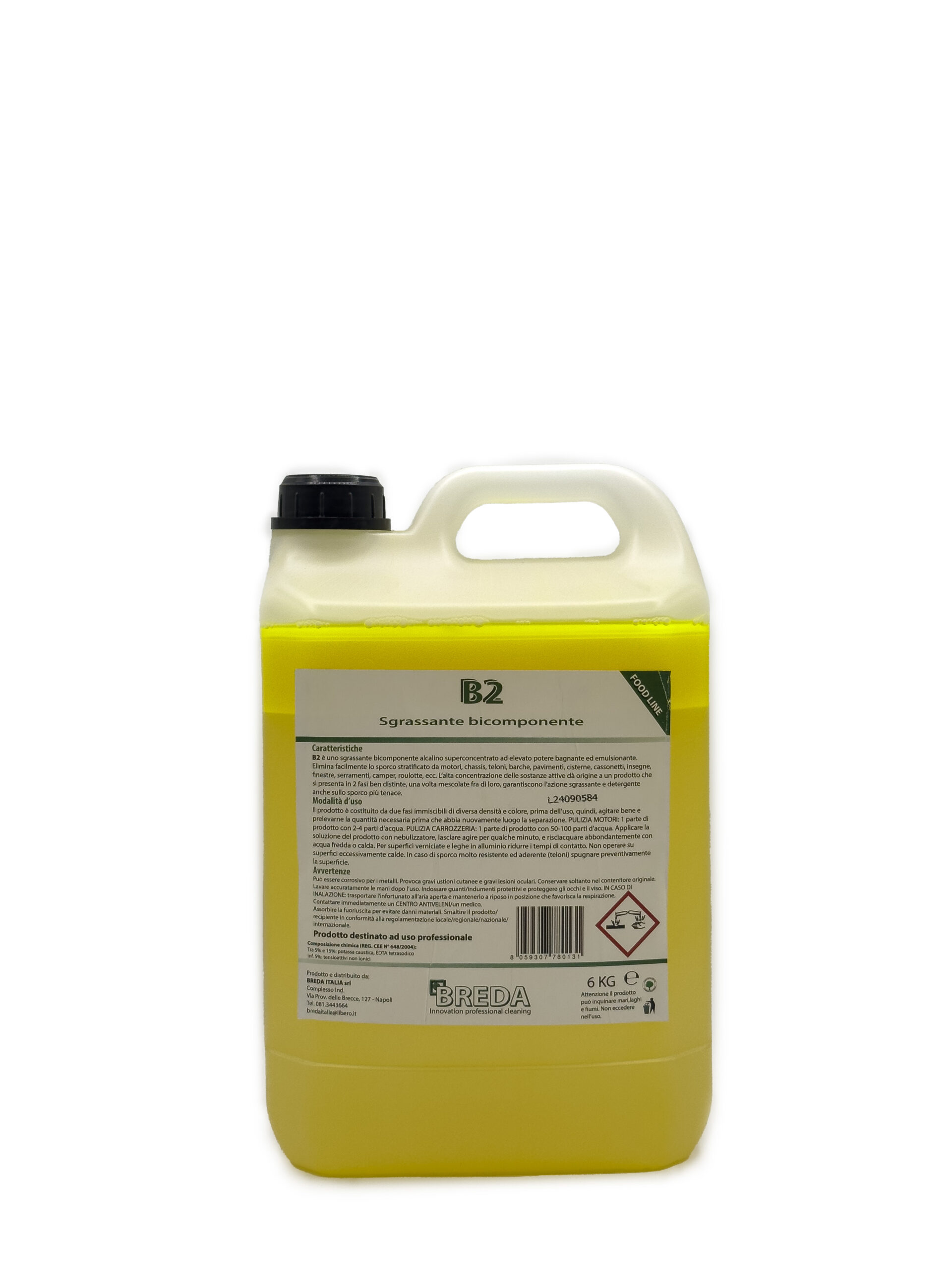 Il B2 non è un comune sgrassatore universale. È un formulato tecnico bicomponente: nel flacone vedrai due fasi separate (una solvente e una detergente) che, agitate insieme, creano una miscela dalla potenza sgrassante ineguagliabile. È progettato per rimuovere lo sporco “impossibile” come morchie di motori, grasso di macchinari agricoli, smog incrostato su teloni di camion e pavimenti industriali neri di olio.