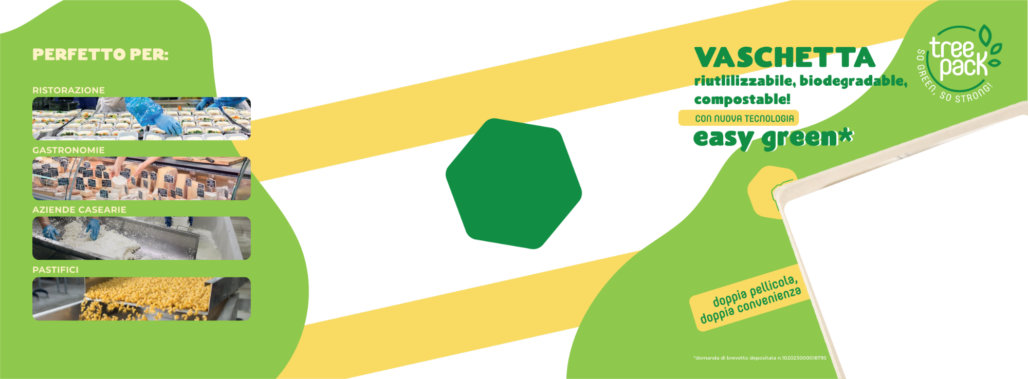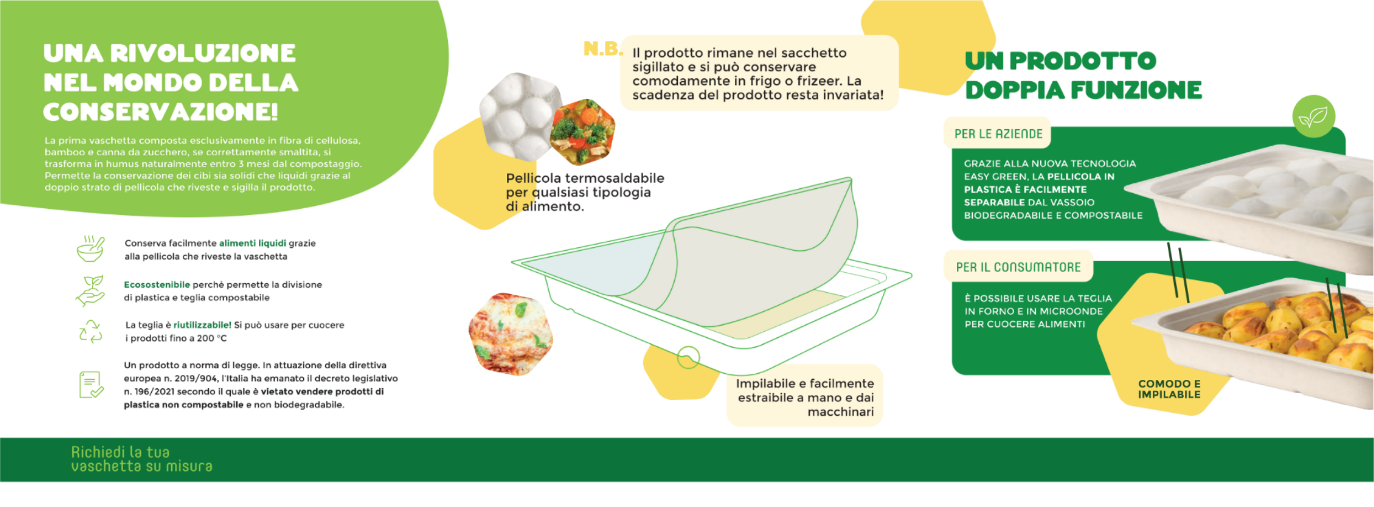 Il problema delle vaschette bio tradizionali è che assorbono l’umidità dei cibi caldi, diventando instabili. Treepack Easy Green risolve tutto: una struttura rigida in fibra vegetale accoppiata a un sottilissimo film protettivo interno. Questo garantisce che lasagne, curry, zuppe o fritti arrivino a casa del cliente perfetti, senza ungere il sacchetto, offrendo la possibilità di riscaldarli direttamente nel contenitore.